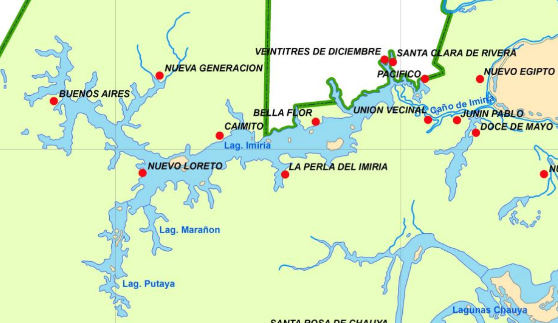 Map of the Indigenous and Campesino communities and settlements around Lake Imiria. (Source: Master Plan of the Regional Conservation Area ACR Lake Imiria - Plan Maestro del Área de Conservación Regional Imiría. Copyrights 2014 Gobierno Regional de Ucayali.