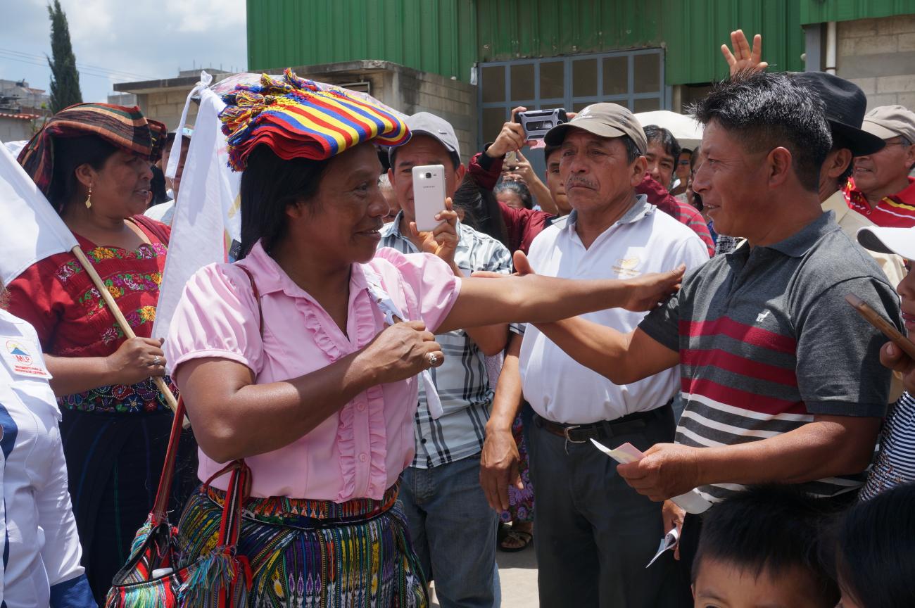 “A nuestras hermanas mujeres ha llegado el momento en que los pueblos tenemos que elegir dignidad, llamo a la reflexión para poder recuperar nuestras tierras, territorios y el agua. Porque los pueblos son los que van a gobernar y van a tener la participación, no es Thelma Cabrera no pedí ningún puesto sino es el pueblo que me eligió y con mi pueblo tengo que estar, con mi pueblo tengo que acudir, con mi pueblo tengo que consultar, proponer y consensuar,” dice Thelma Cabrera Pérez