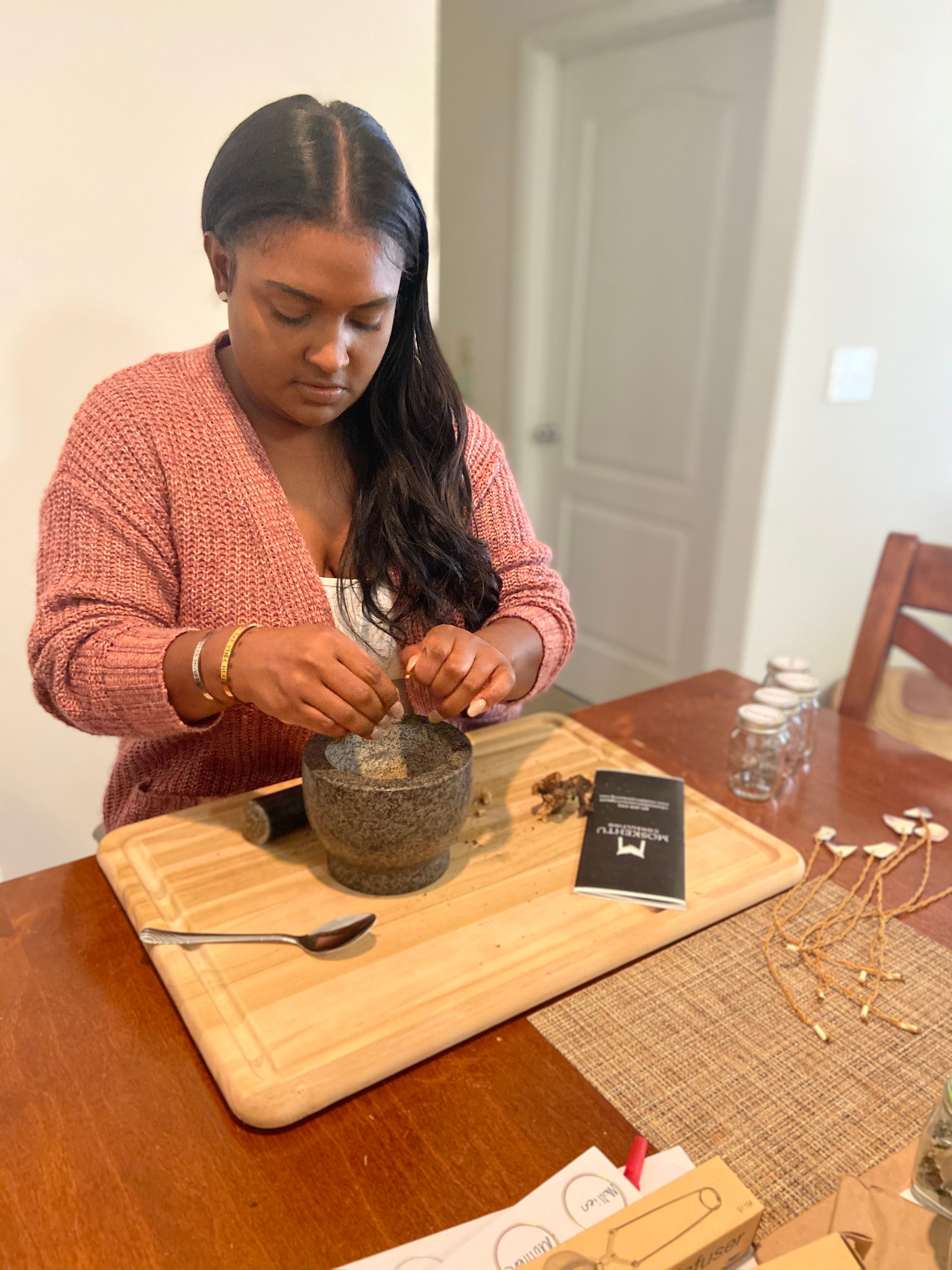 Chenae Bullock making herb teas with herbs she has foraged. Photo by Esther Lee.