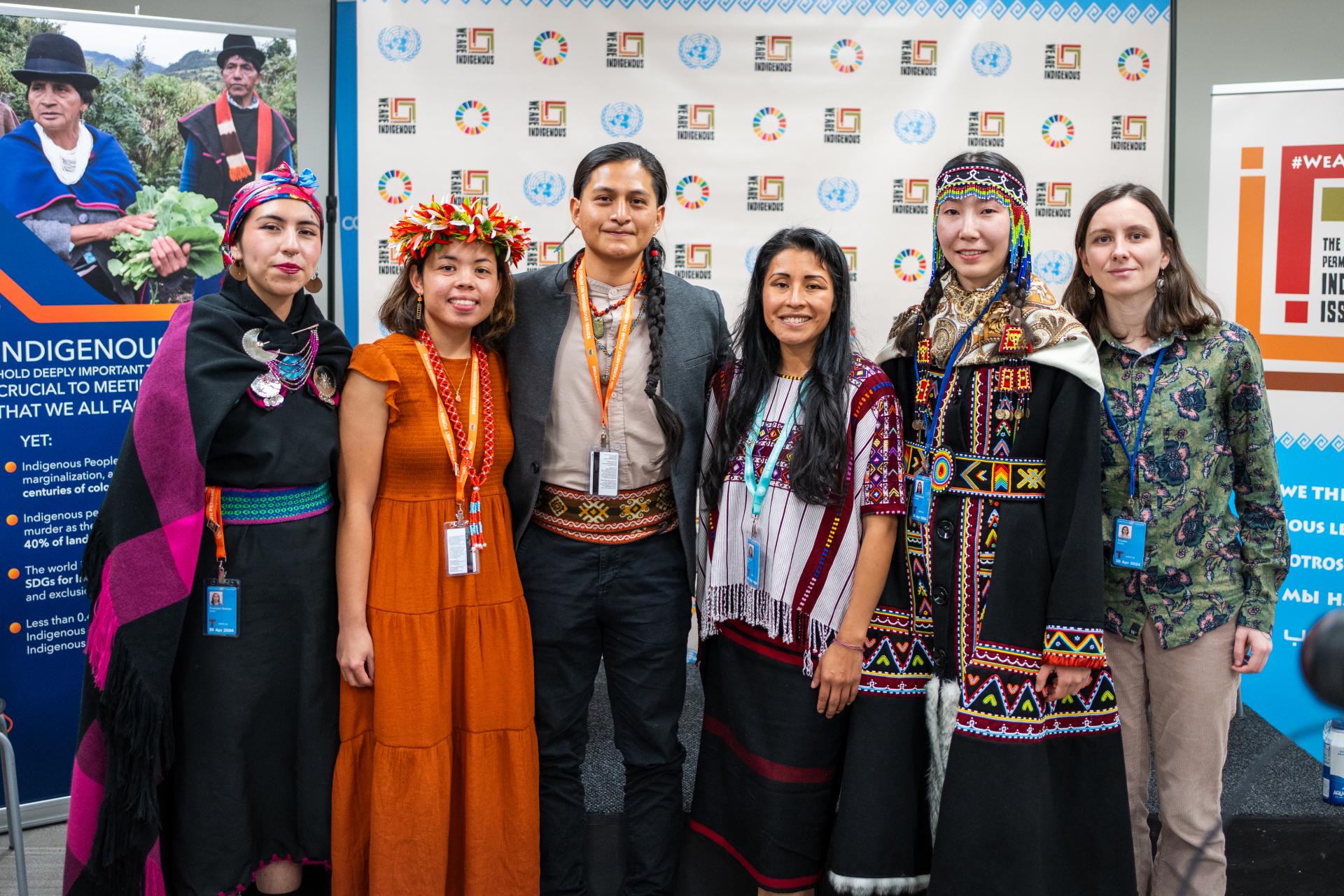 Byron Tenesaca Guaman (third from left) with Cultural Survival Youth Fellows and staff at the 2024 UN Permanent Forum on Indigenous Issues.