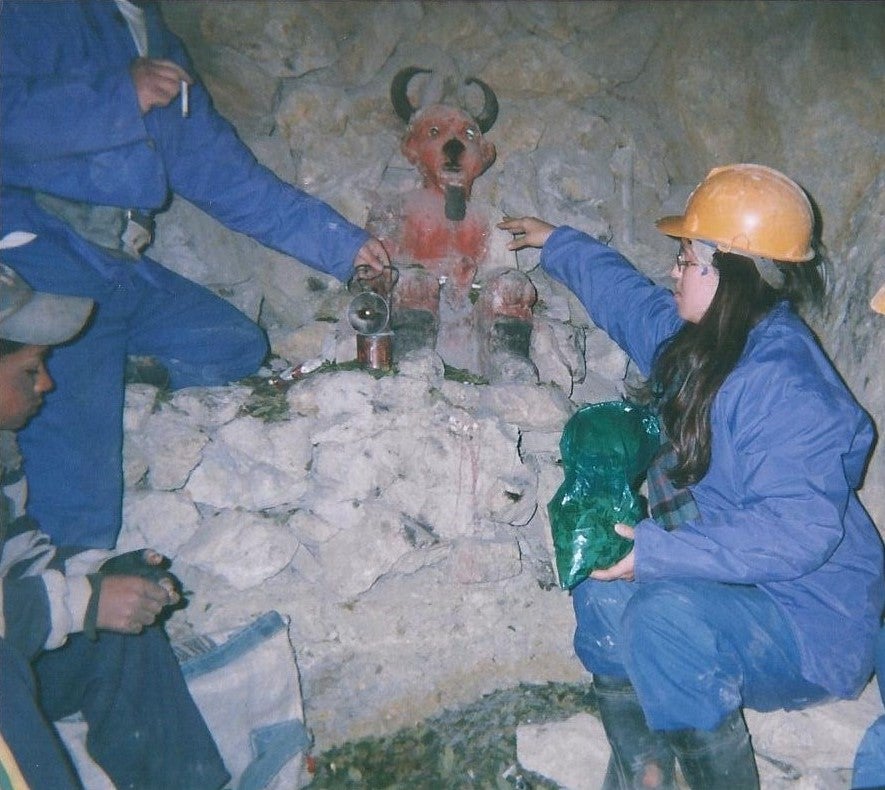 Cerro Rico is also known by another name: el cerroque come los hombres, or “the mountain that eats men.” As a student that summer in Potosí, I witnessed firsthand how it acquired this name during a program field trip led by two miners who took our small student group deep into the mountain on an official mine tour. Equipped with working suits, hardhats, and flashlights, other compulsory items we had to purchase before entering the dark caverns included cigarettes, coca leaves, and small bottles of 90-proof alcohol—the favorites of Tio Diablo, or “Uncle Devil,” who oversees everyone and every activity that happens deep in these mines.