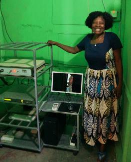 Photo: Lydia Ajono, Radio Gurune founder, stands next to a 1KW transmitter, which allows the station to reach a listener audience of 2 million in rural Ghana. Photo by Danielle DeLuca.