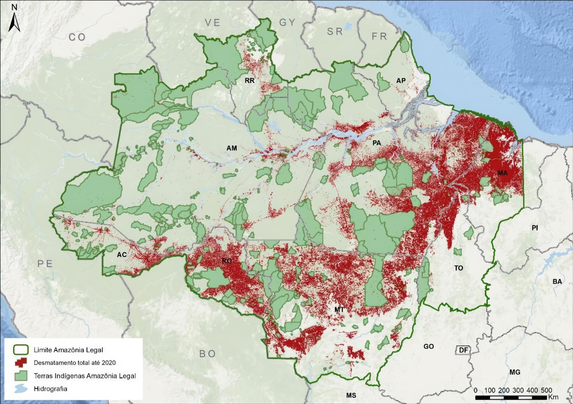 Red areas indicate total deforestation as of 2020. Source: elaborated by IPAM, based on INPE/PRODES data, 2020.