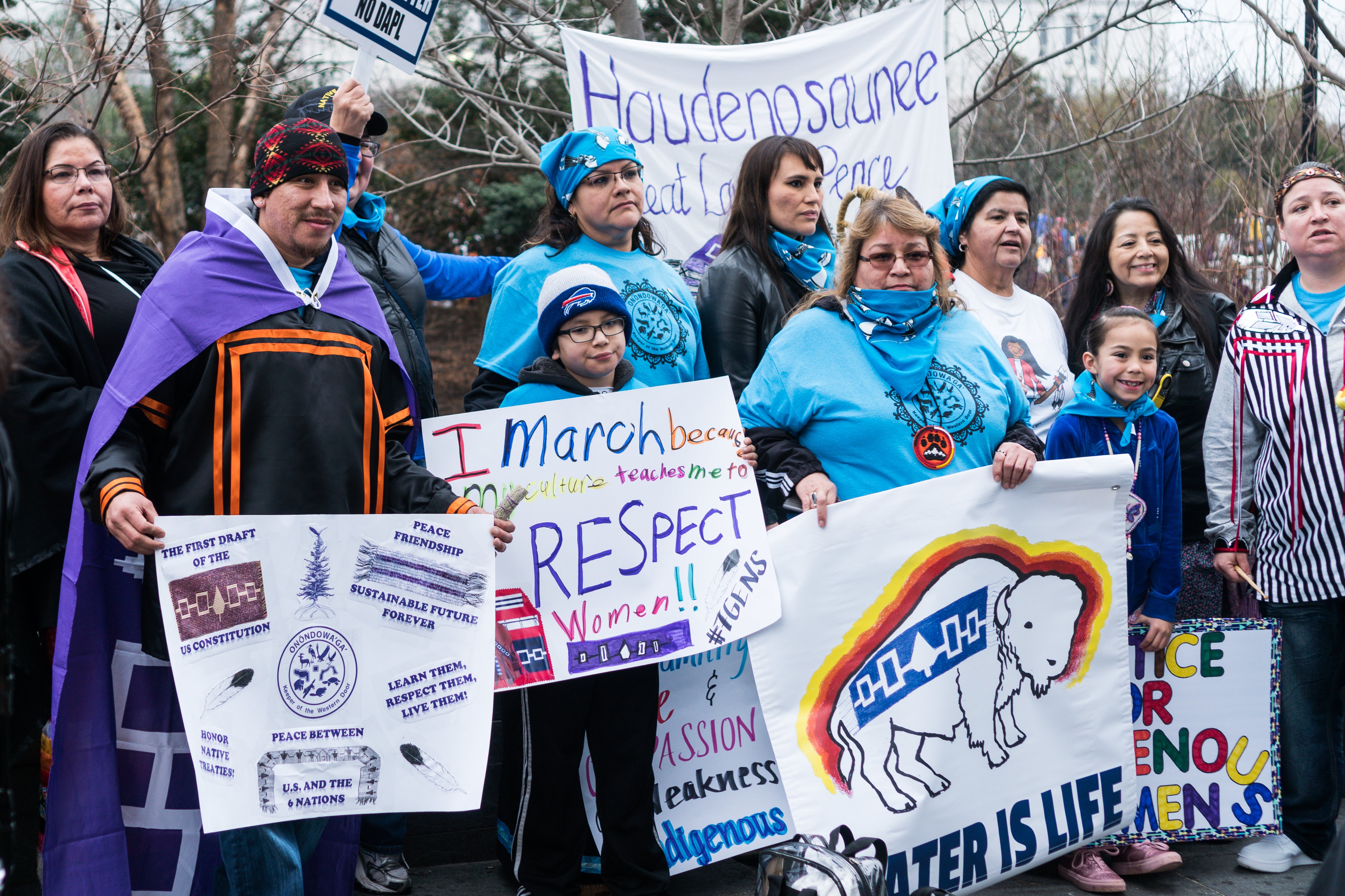 Indigenous women were present in the resistance all over the country, affirming that we are still here and fighting for our rights. Many cities invited Native women to be part of the official programs. In Washington, D.C., Judith LeBlanc, director of Native Organizers Alliance, and LaDonna Harris, president of Americans for Indian Opportunity, spoke at the main rally while Jennifer Elizabeth Kreisberg of Ulali, a First Nations acapella trio, sang. In Boston, organizers invited Love Pegan Richardson (Nipmuc), Leslie Jonas (Mashpee Wampanoag), and Claudia Fox Tree (Arawak/Yurumein) to speak. Savannah Fox Tree McGrath (Arawak/Yurumein) sang Amazing Grace in Cherokee.