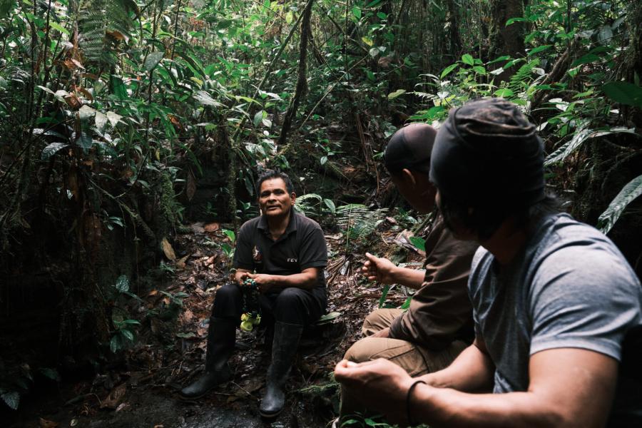 Another way we encounter the sacred Arutam is in sacred waterfalls. Every family goes to the waterfalls to bathe and purify themselves. We do this once or twice a year. When the people are prepared, we go on a trip together to the sacred waterfalls. During the night, everyone that is there drinks the sacred plant. The next day, we have to prepare ourselves. There is one adult who is the leader of the group, and before we go into the sacred falls, he needs to sing to ask permission of Arutam to enter into the sacred waterfalls. This song is a sacred song. This sacred song says, “Father Arutam, come with my children and open your doors.” When he’s finished singing, we begin walking toward the sacred waterfalls.