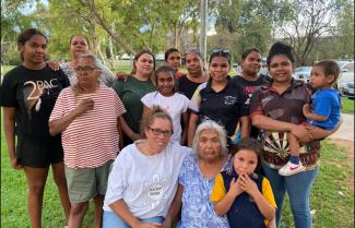 Top photo: Pertame family members during an Adult Language Class in Alice Springs. L-R: Brittany Swan, Sharlene Swan, Leeanne Swan, Kayla Dashwood, Michelle Swan, Abby-lee Dodd, Justyse Nandy, Auriel Swan, Shania Armstrong, Christobel Swan, Sumaiya Nandy, Samantha Armstrong, Diandra Armstrong, and Max King. Photo by Vanessa Farrelly