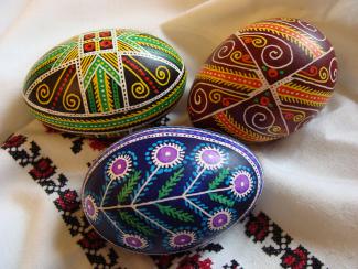 With the advent of Christianity, the symbolism of the egg was changed from representing nature’s rebirth to the rebirth of man. The most important symbols used on pysankas in the Hutsul region include triangles, which symbolized clouds or rain; quadrilaterals, symbolizing a ploughed field; spirals, the mystery of life and death; and dots, representing stars. Cosmological, floral, and animal motifs also are used to adorn the egg. Pysankas are typically made to be given to family members and respected outsiders during the last week of Lent, Holy Week, before Easter. To give a pysanka is to give a symbolic gift of life.