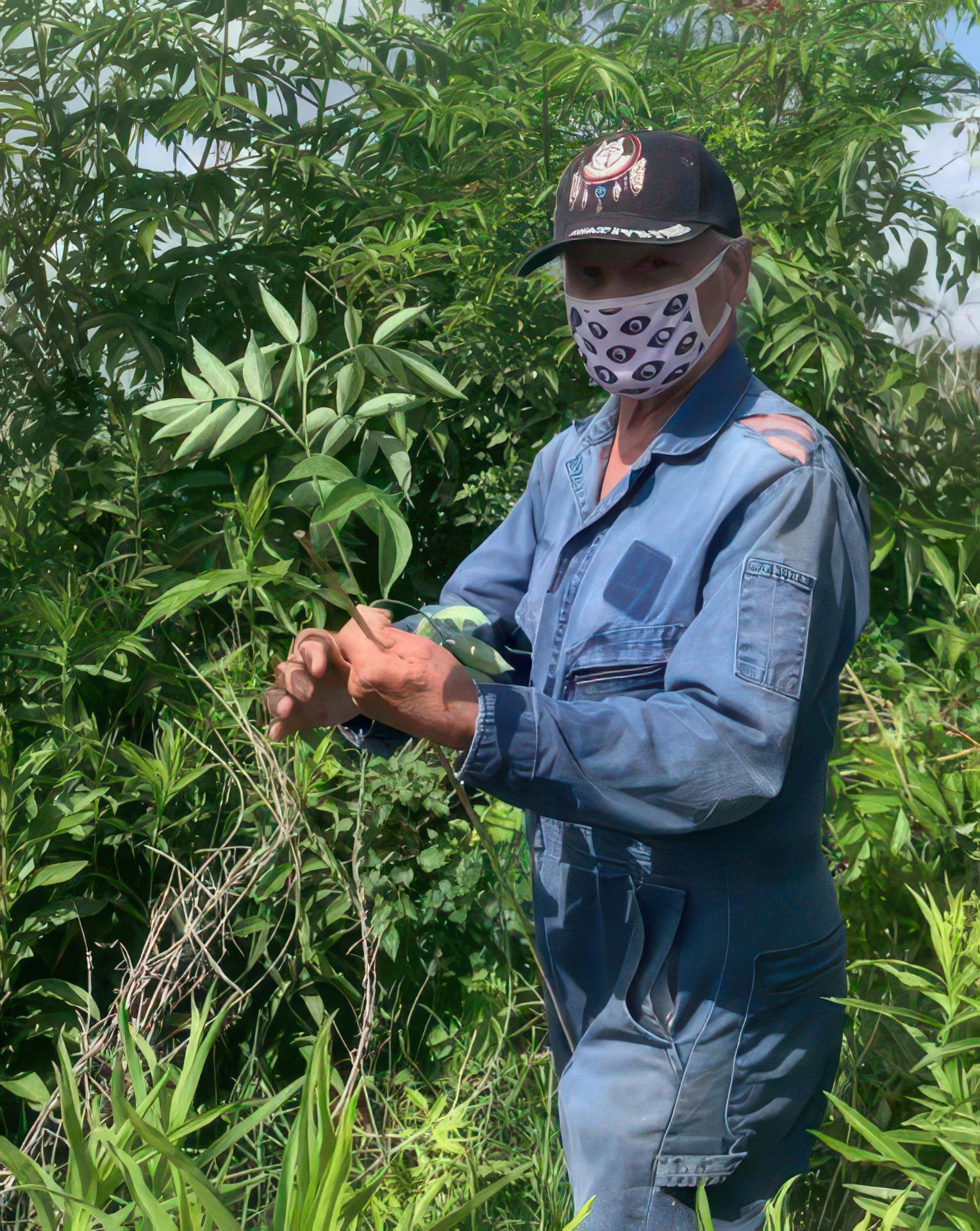 The authors’ uncle, Peter Verdin, harvesting elderberries in Dulac, Louisiana on the bayou side. Elderberry blossoms are gathered for medicinal use by the Houma. Photo by Rochelle Morgan-Verdin.